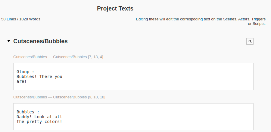 Editing a text on this area will edit the corresponding text on the Scene, Actor, Trigger, or Custom script.