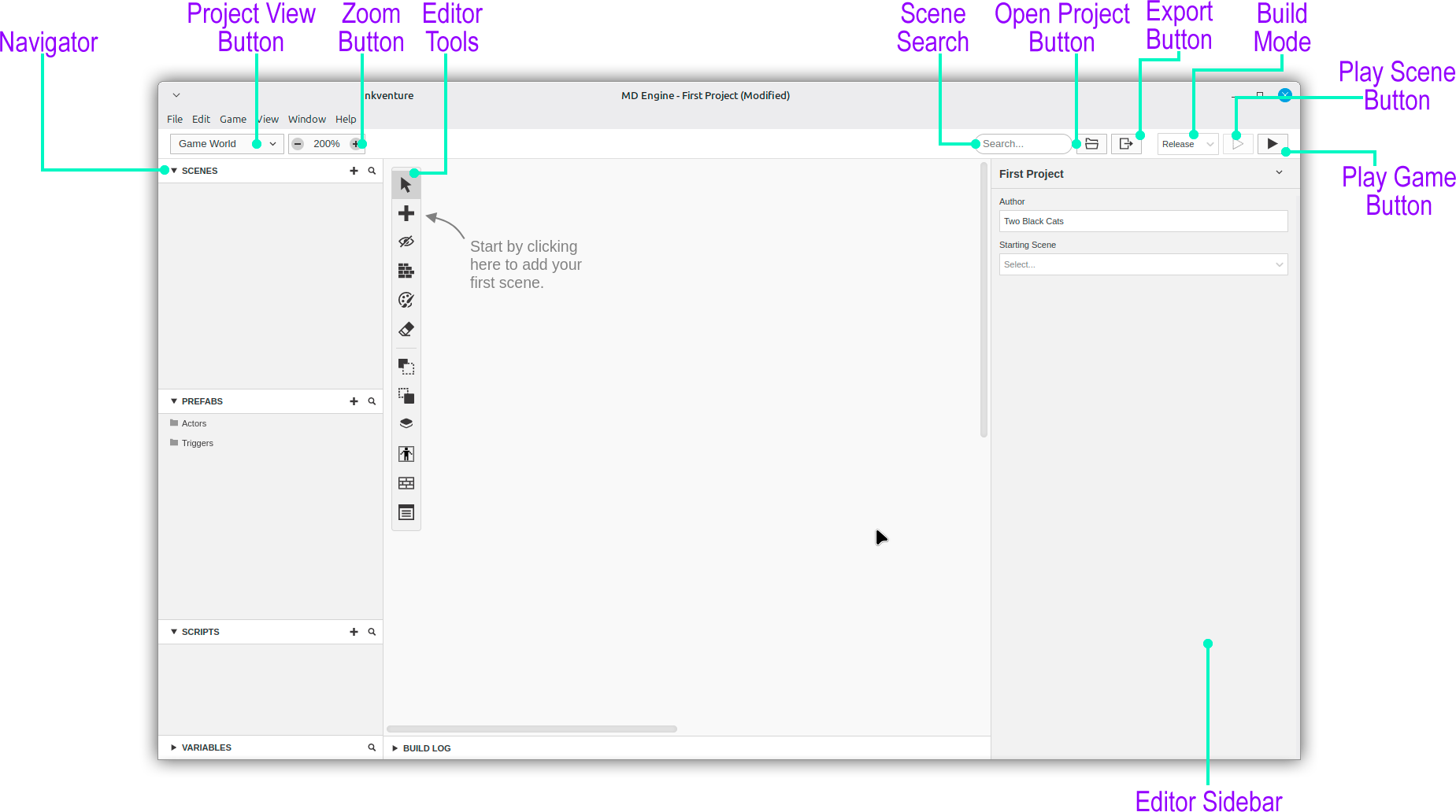When openning MD Engine, the first view is for the Project Editor is the Game World.