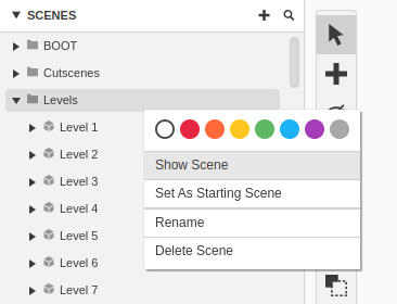 The scene context menu shown below allows you to set color labels, set the scene as the starting scene for your project, rename and delete the scene.