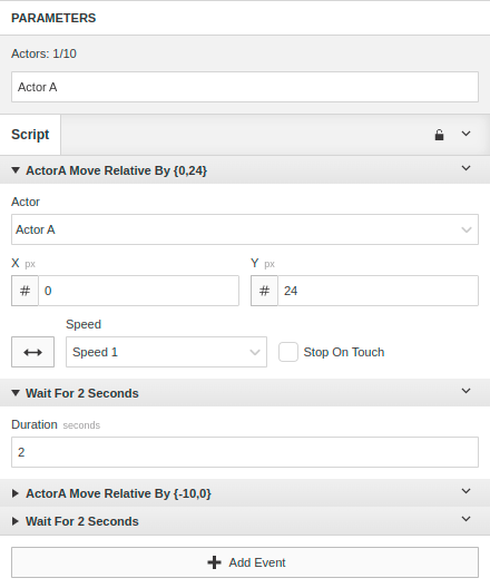 For example the following custom script makes Actor A move down, wait and move left.