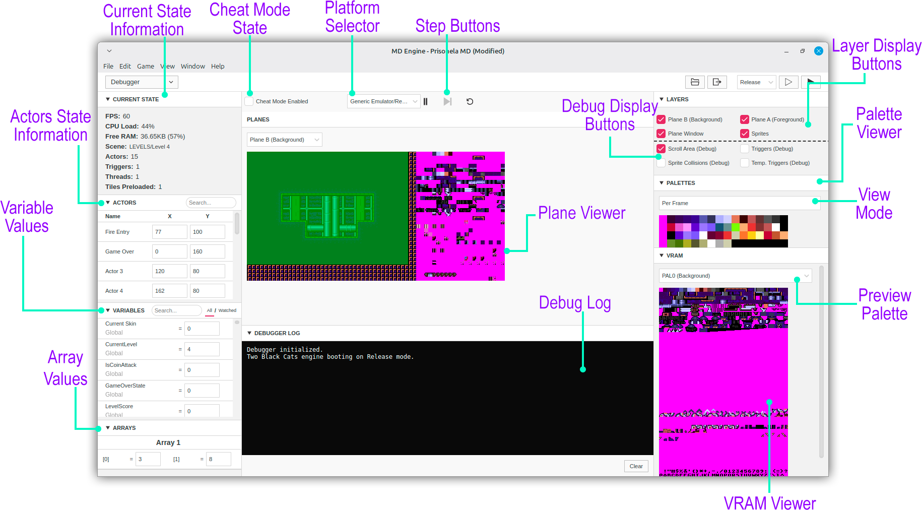 The Debugger view allows to examine the current state of your game in real-time, assisting you in identifying and resolving issues as you develop your game scripts.